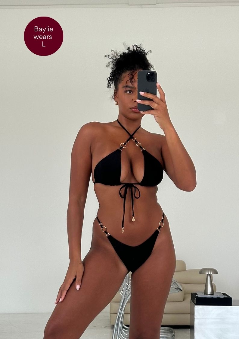 The KAIA bottoms are that perfect mix between your standard bikini bottoms and thong coverage. Detailed with custom asymmetric gold rings, they're bound to turn heads with the plunge front and back cut to elongate your figure. Our KAIA bottoms are designed to sit above your hips so enhance your curves.