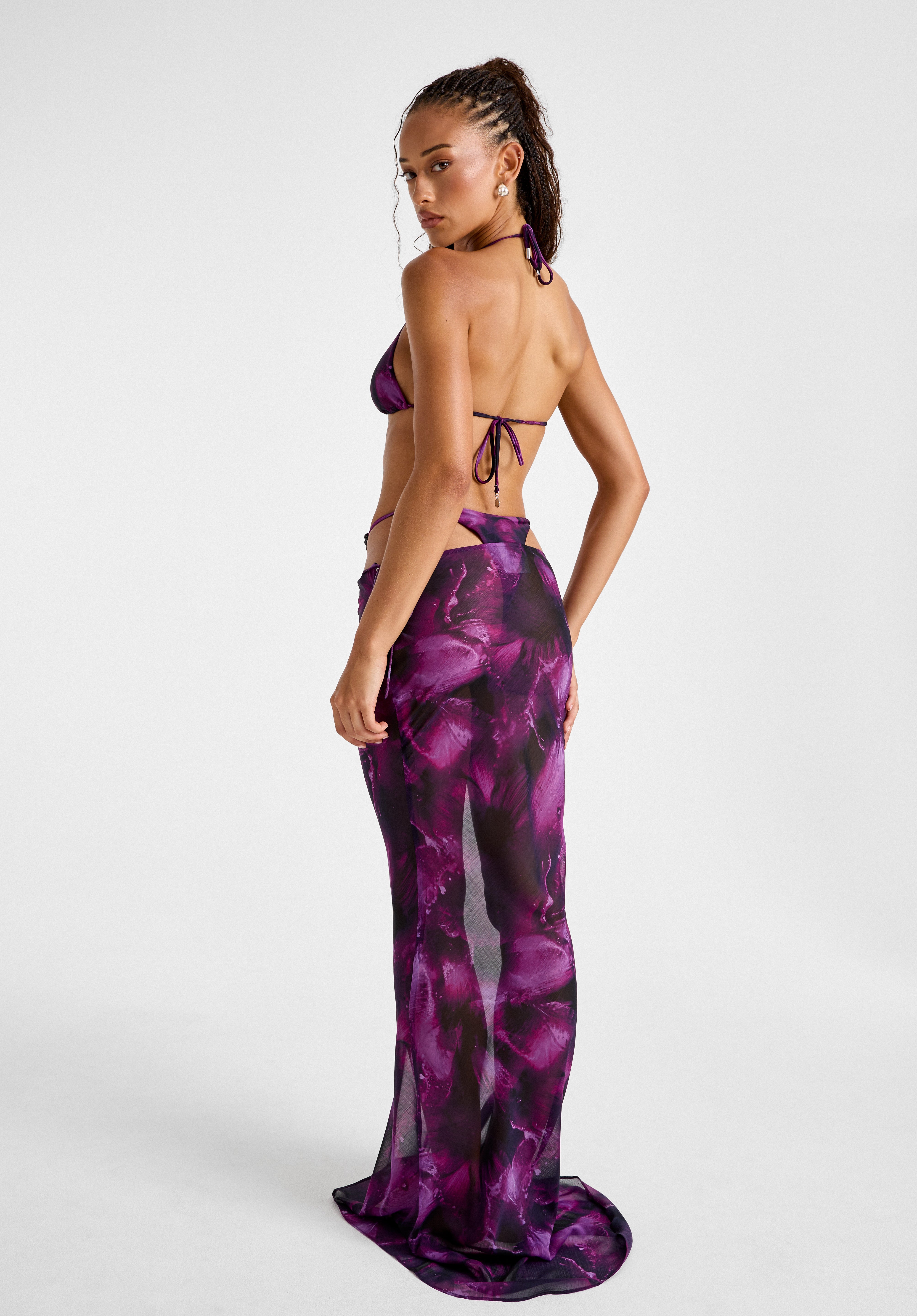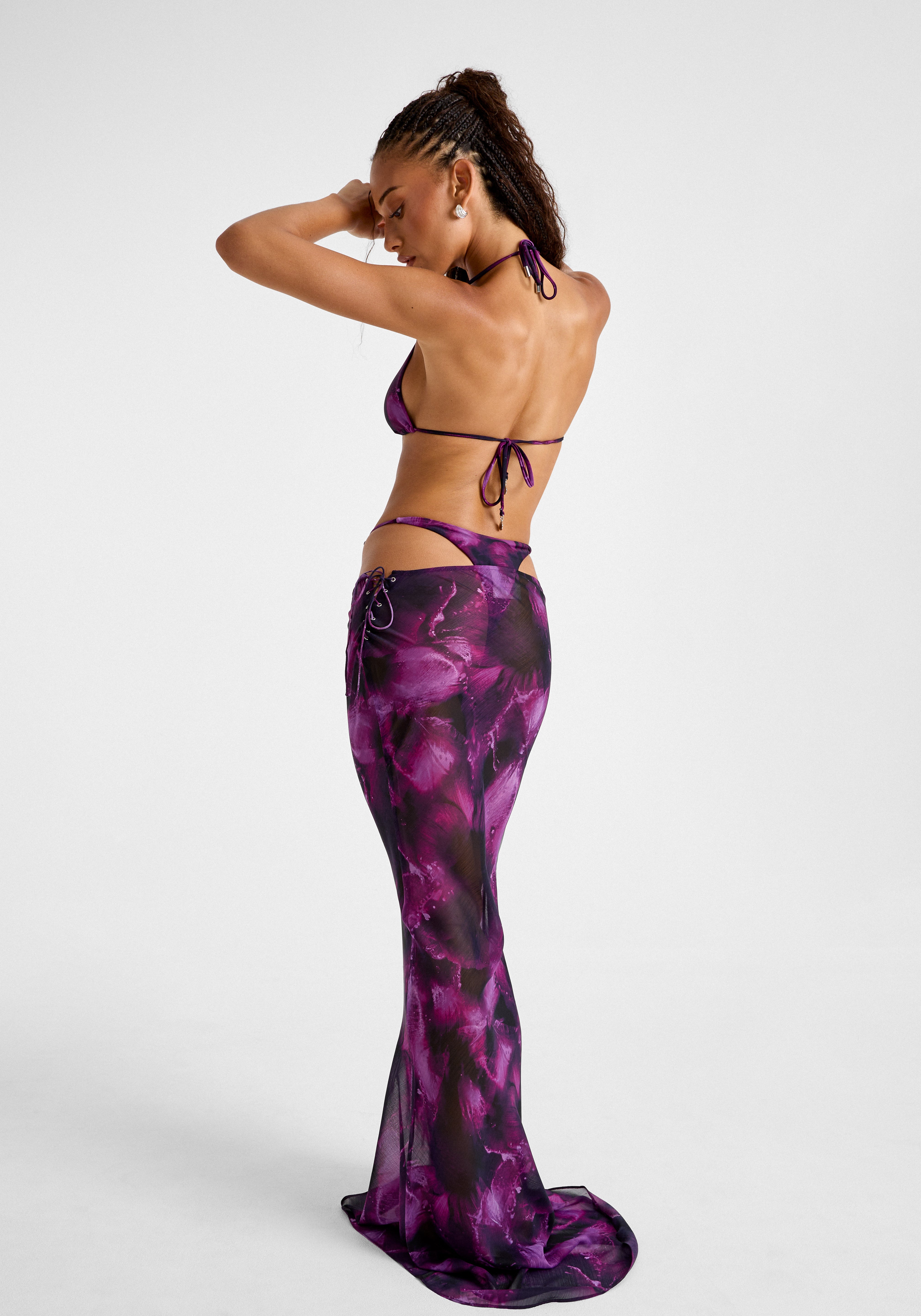 RIVER, our new skirt that's designed to sculpt your waist and give you that hourglass shape we all love, this skirt is all about showing off your curves. In our new ASTER print, the flowing train adds just the right amount of drama, with a textured chiffon fabric that feels light and dreamy.