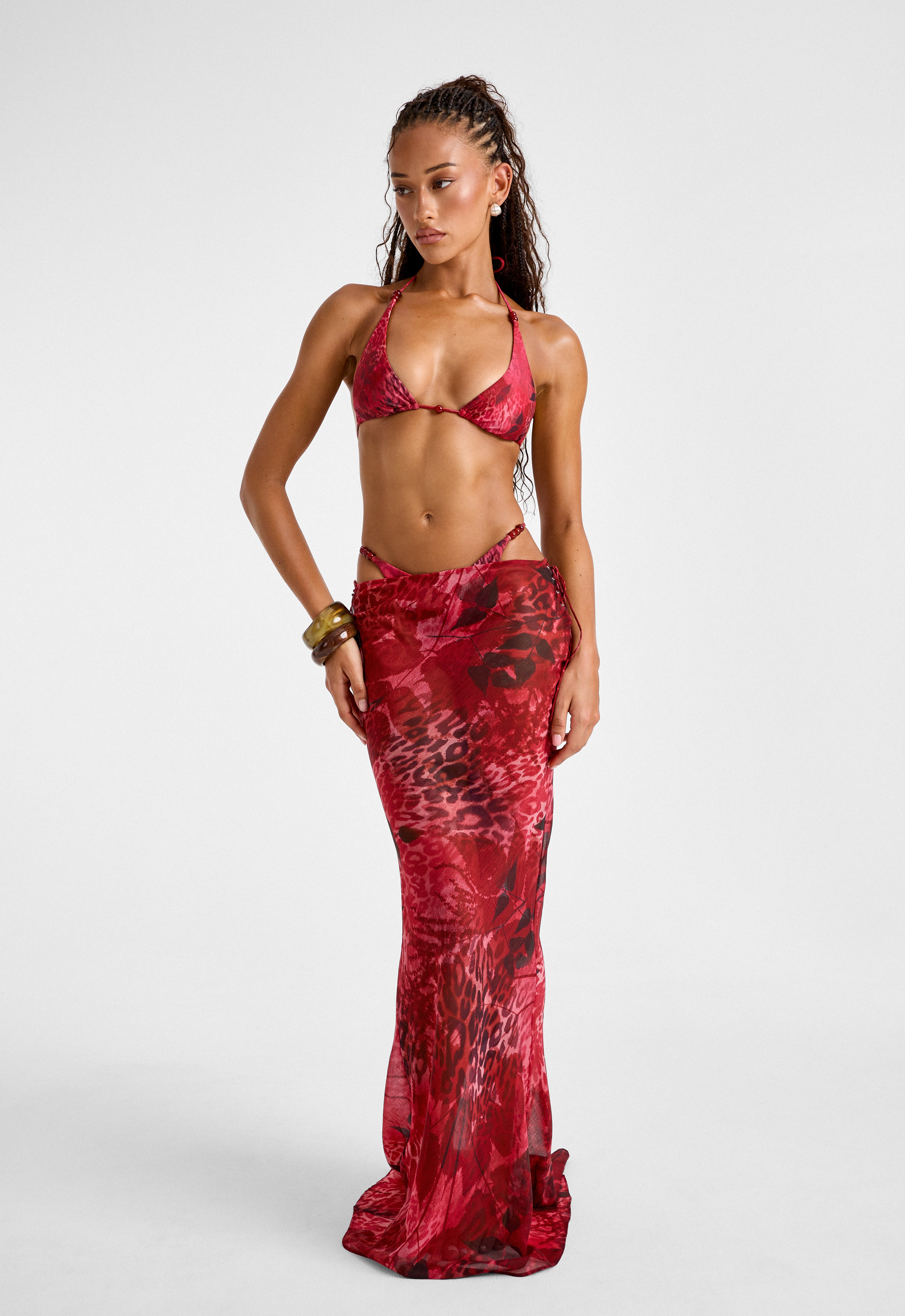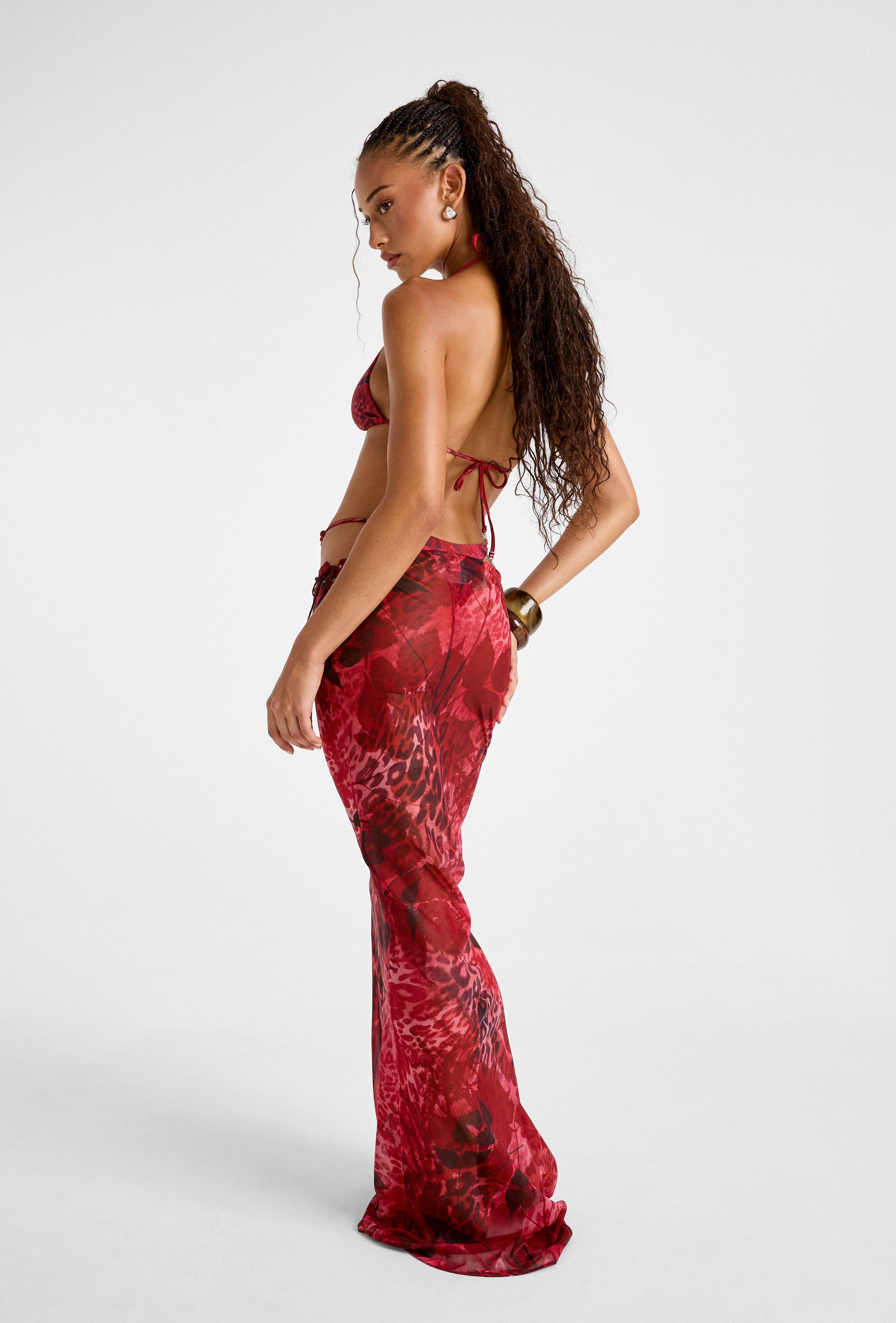 RIVER, our new skirt that's designed to sculpt your waist and give you that hourglass shape we all love, this skirt is all about showing off your curves. In our new Untamed print, the flowing train adds just the right amount of drama, with a textured chiffon fabric that feels light and dreamy.